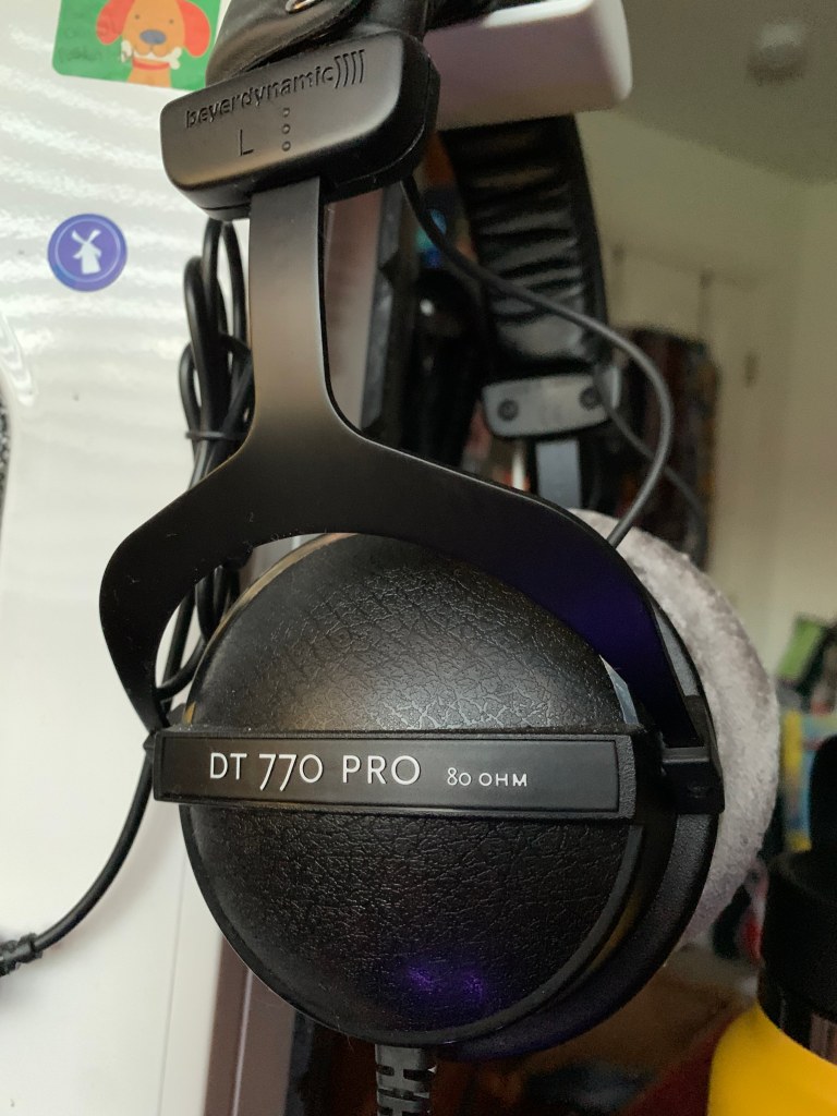 I got the similar bug and asked for the DT 770’s for Christmas. They were unlike anything I had ever head before. Were they comfy? Yes. Did they feel nice? Totes! These have semi-soft velour ear pads and a funky 80’s texture on the outside of the cup. The padding on the top band is wrapped in what feels like the the thinnest pleather material, but it has yet to show even a scratch or bit of wear. They have a long cable. I’m not one for numbers but this bad boy is like 10 feet long (enough for them to be plugged into my desktop amp and reach comfortably to my pillows for bed-based listening).